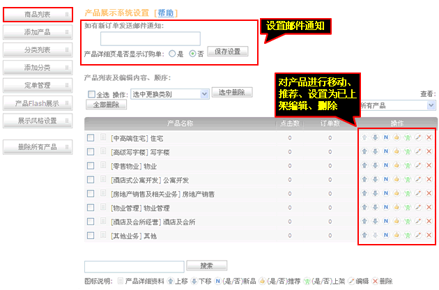 移动、推荐、上架、编辑、删除